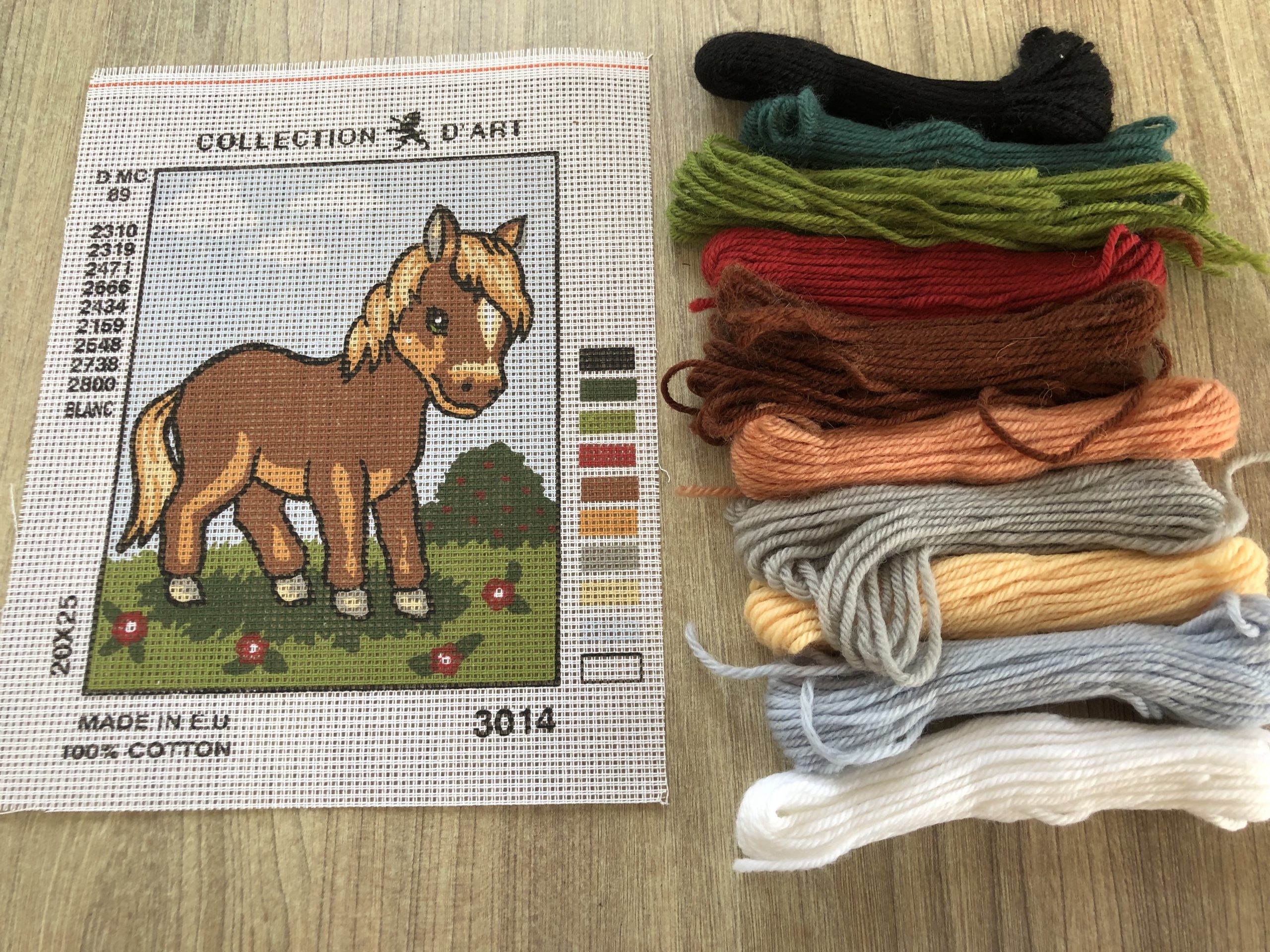 The kit includes the printed canvas, wool, needle and instructions.