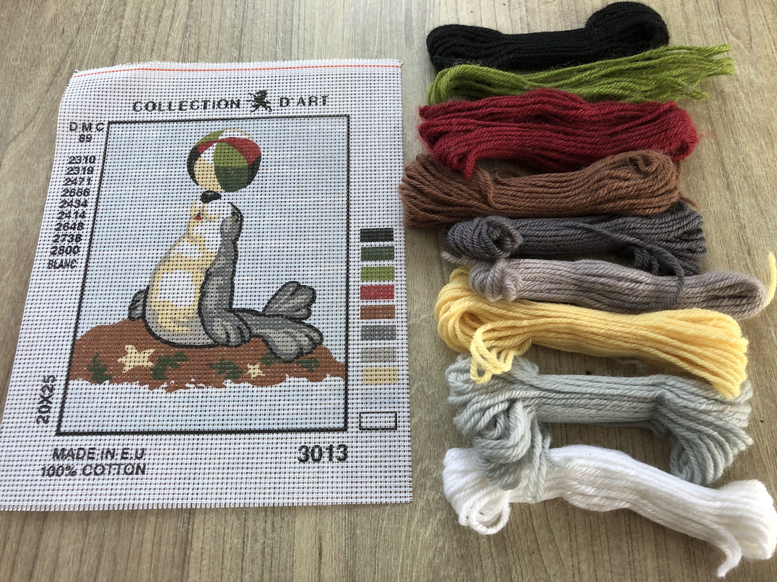 The kit includes the printed canvas, wool, needle and instructions.