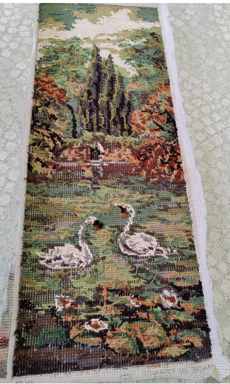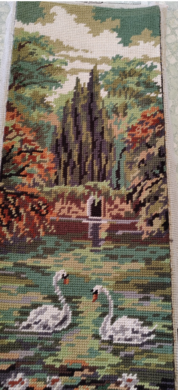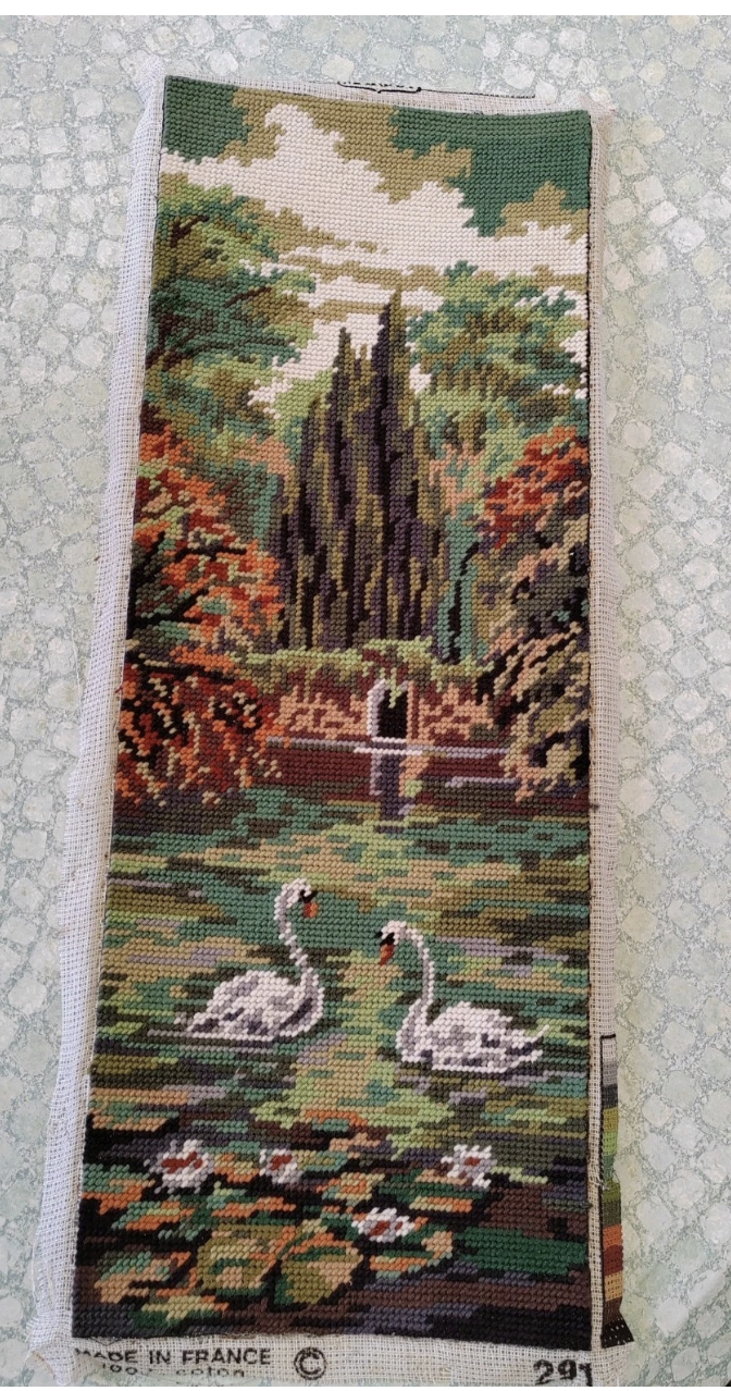 The Margot de Paris Tapestry Needlepoint features a beautiful design of white swans, intricately embroidered using the needlepoint technique.
