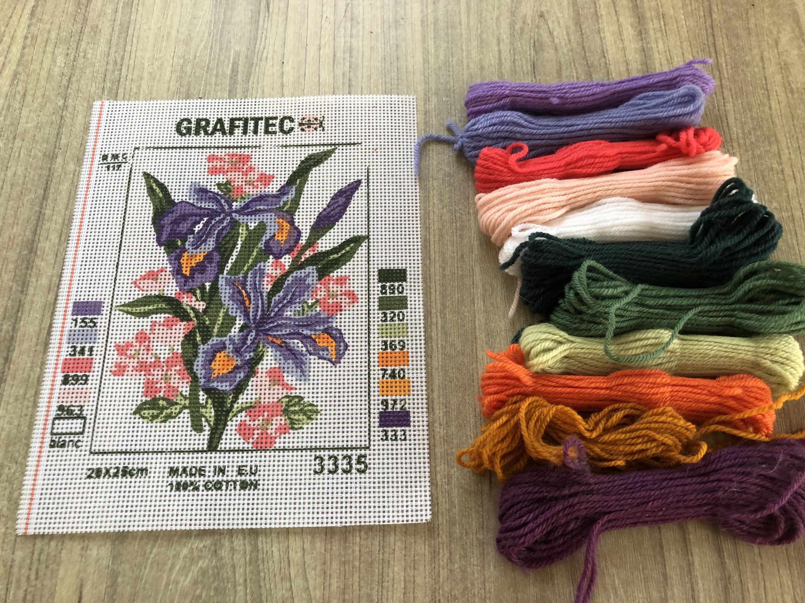 The kit includes the printed canvas, wool, needle and instructions.