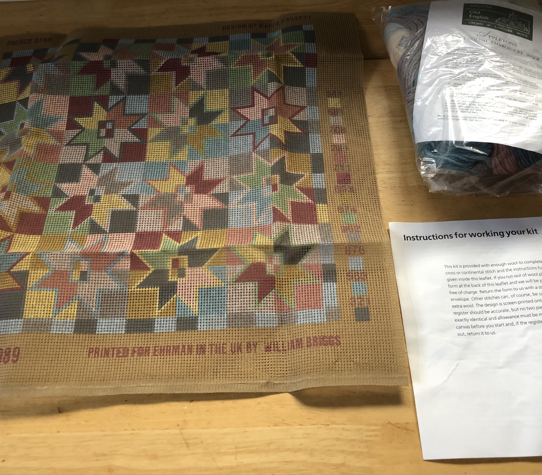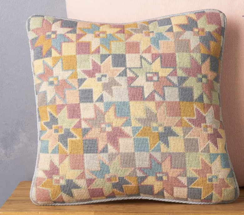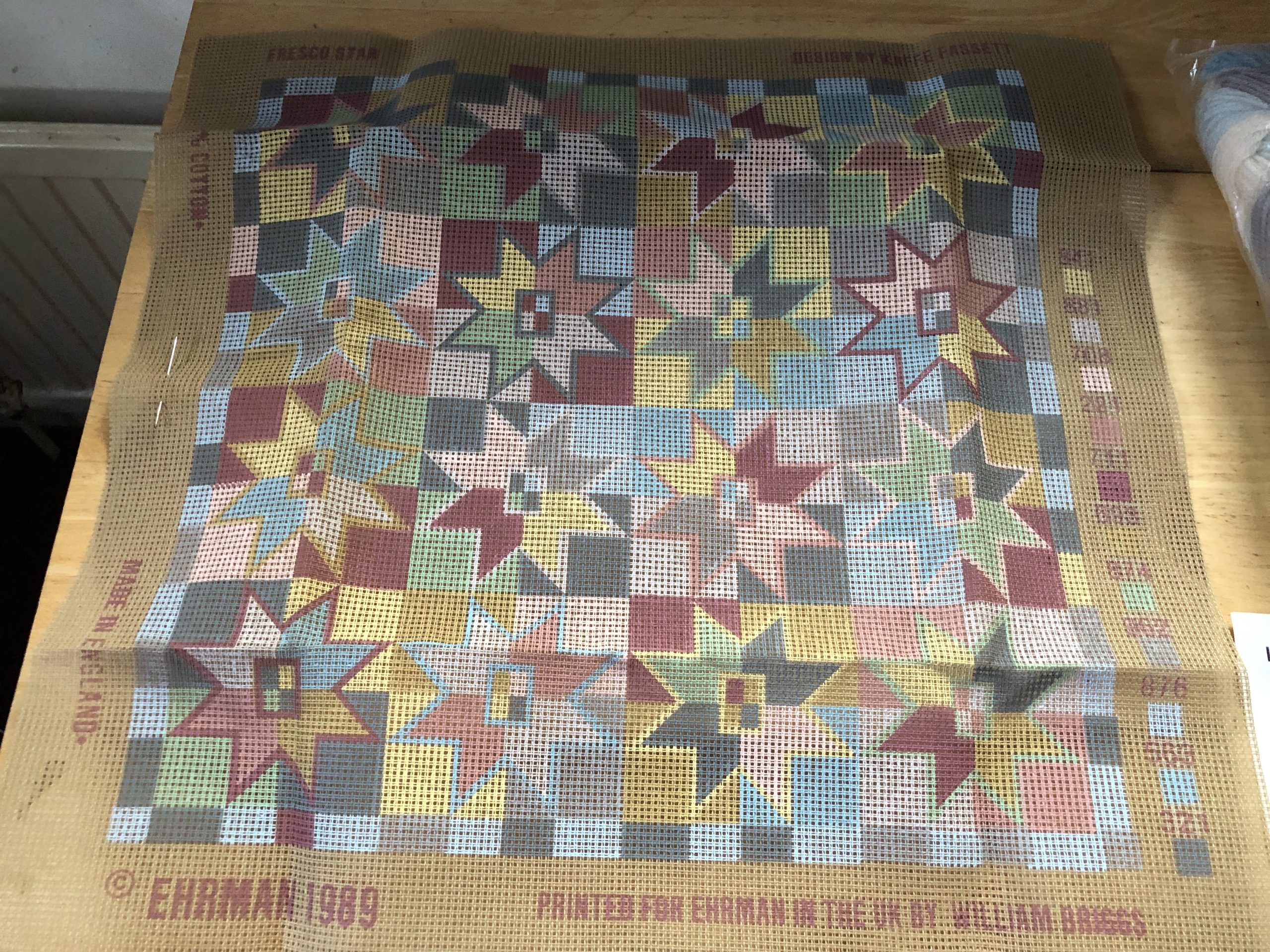 Fresco star was one of Kaffe’s first designs for Ehrman and appeared in his book Glorious Needlepoint. “Fresco Star has an Islamic tile theme and with its subdued colours would blend into most settings” he said. ” It is one of my favourite designs for a cushion”.