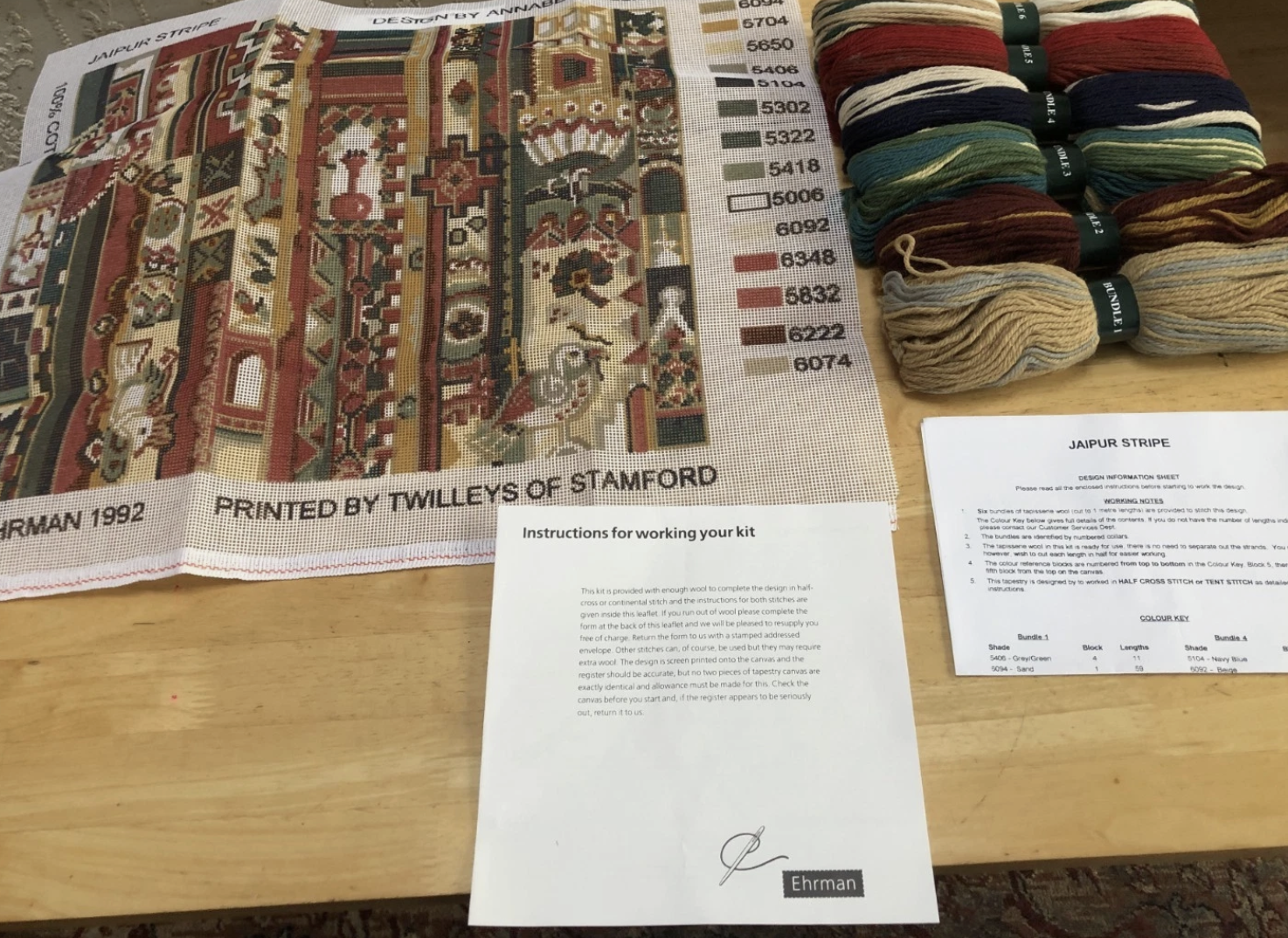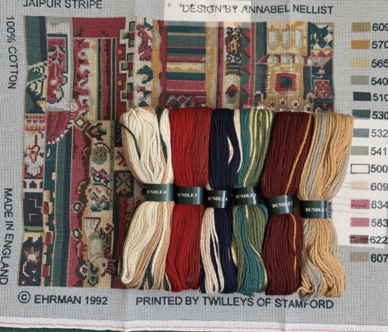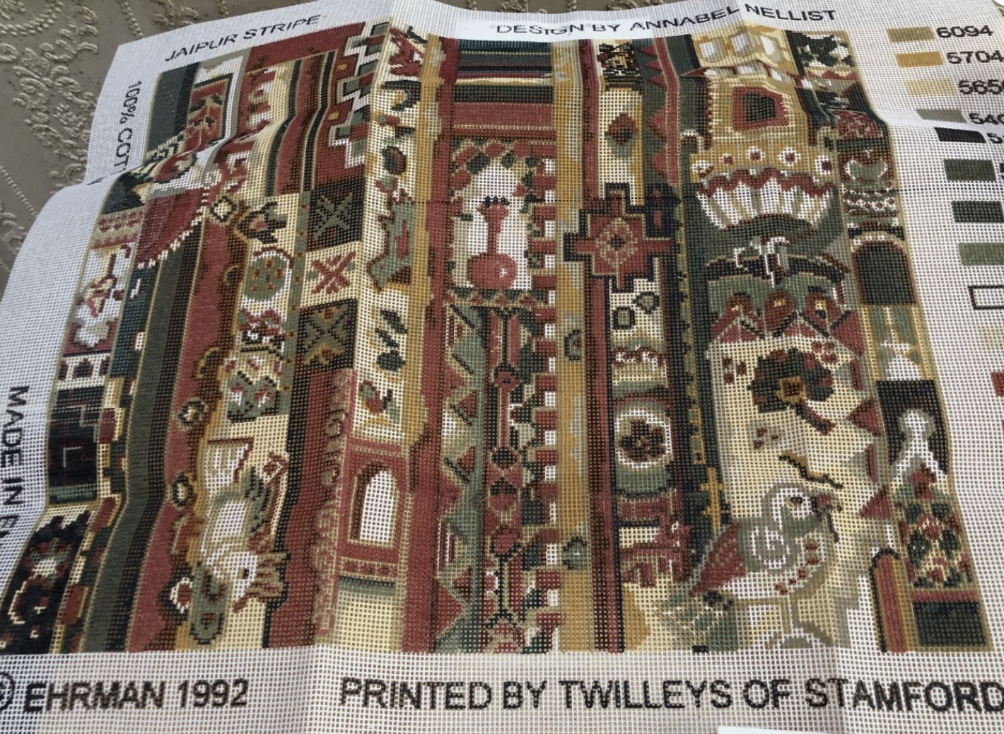 Ehrman Tapestry kit ( 1992) Pre printed canvas ( 12 stitches to the inch ) ‘Jaipur Stripe’, Annabel Nellist, printed in England by Twilleys of Stamford