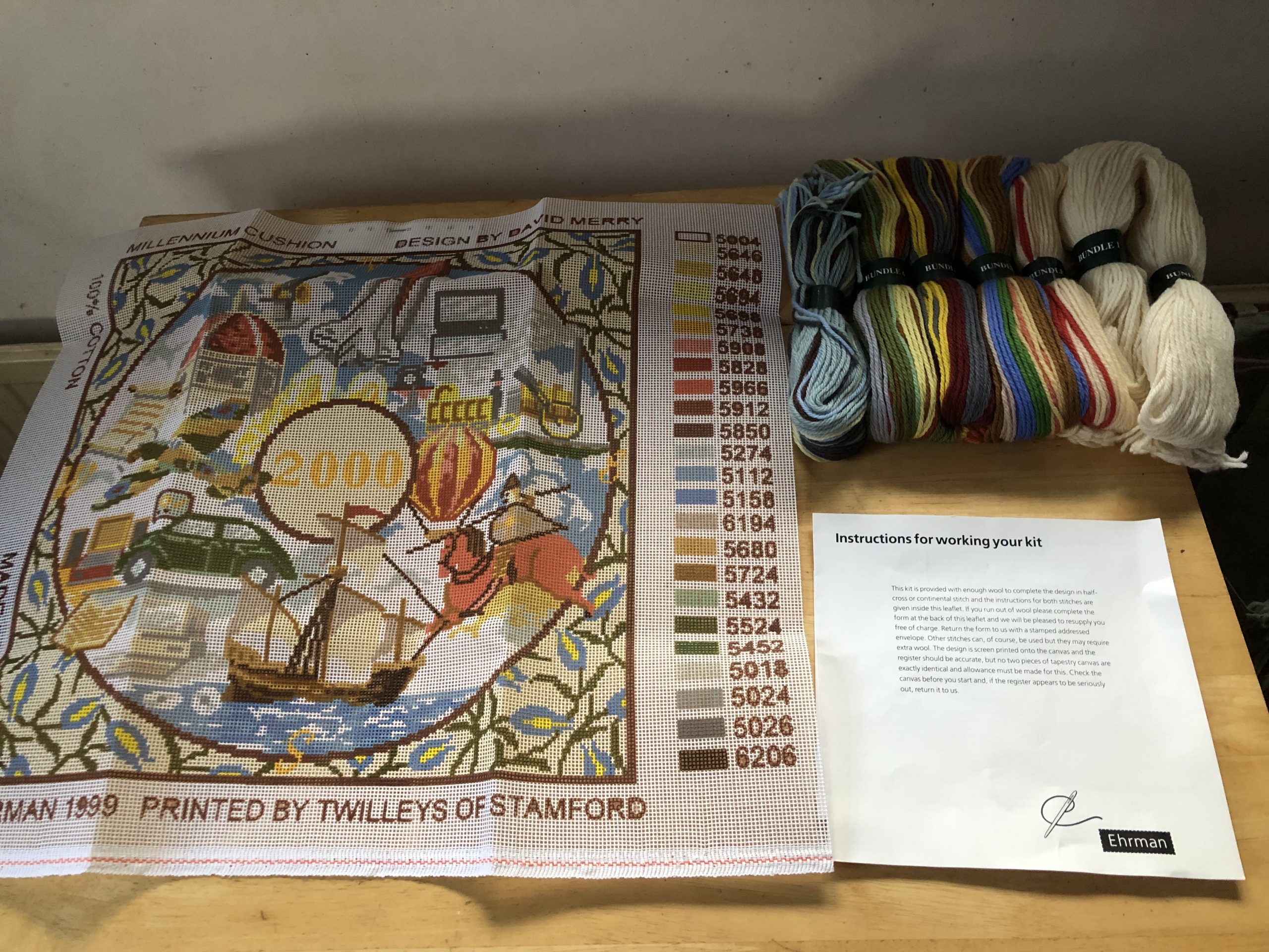 The kit includes the printed canvas, needle, wool and instructions.