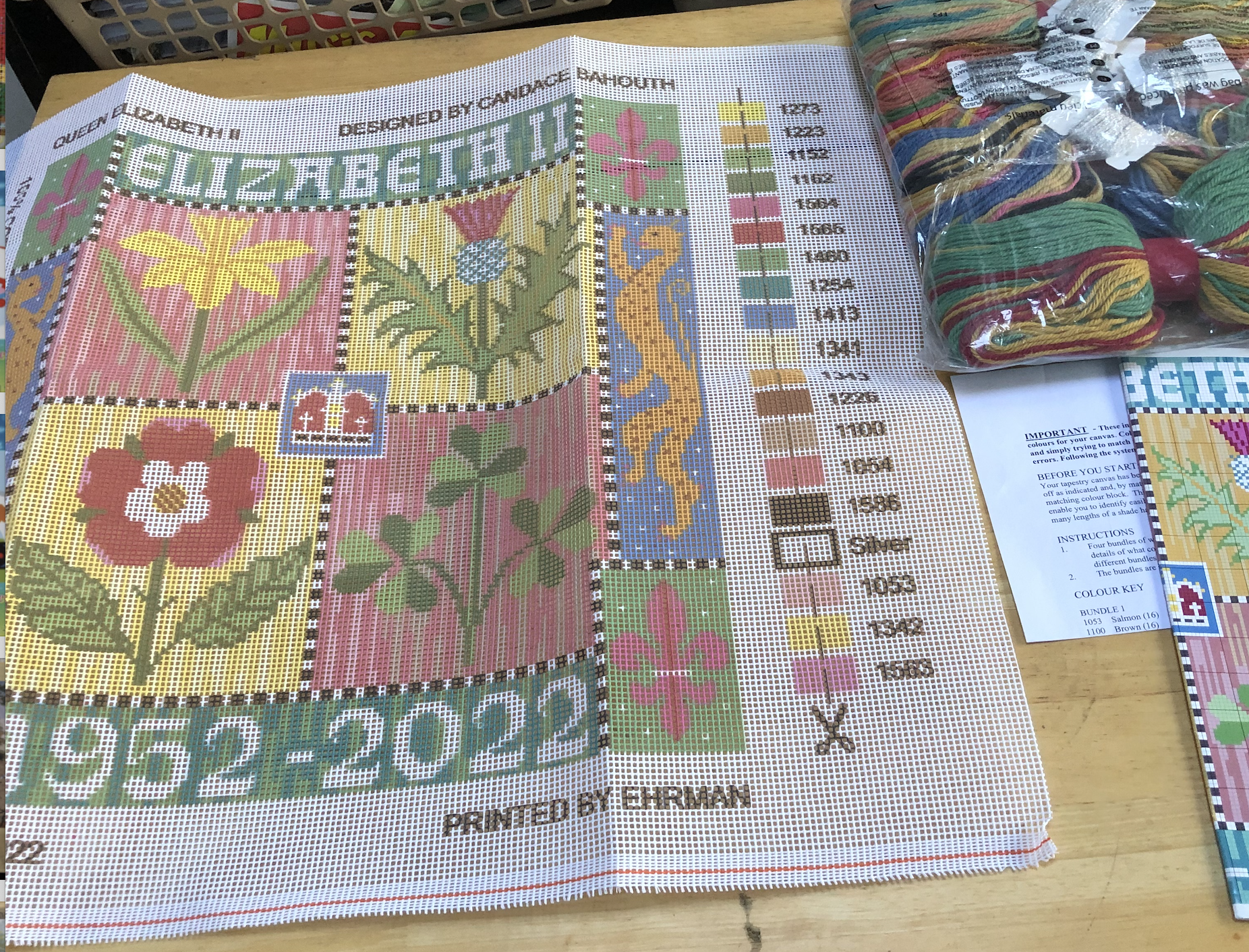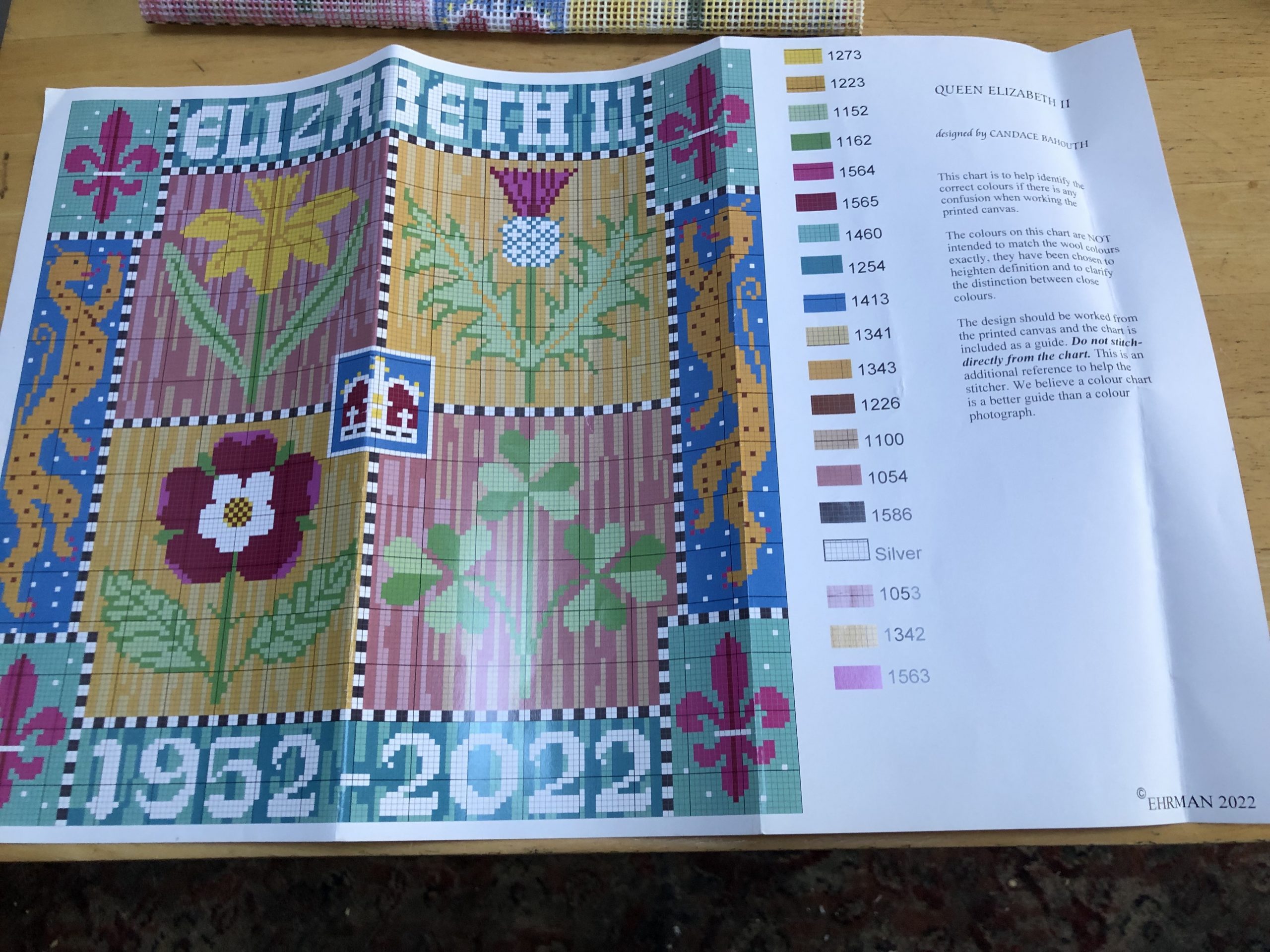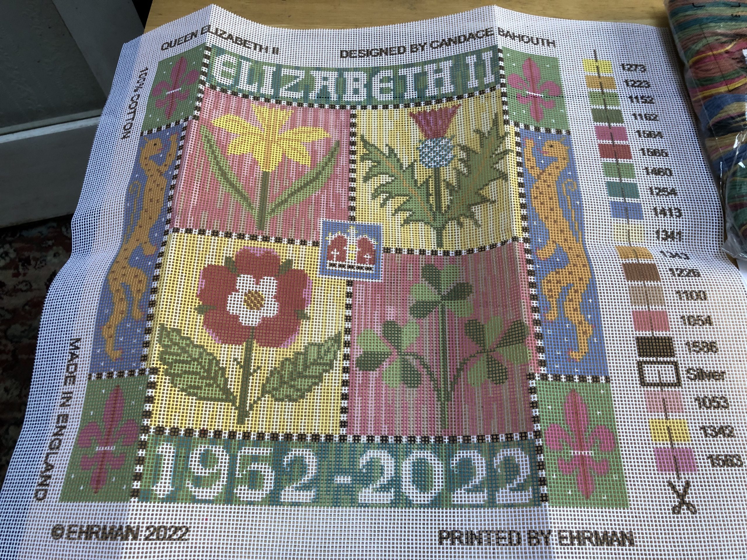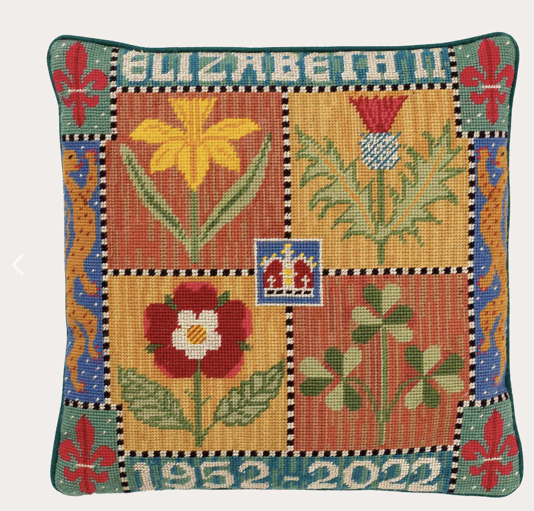 This beautiful cushion was designed as a tapestry kit by Candace Bahouth and celebrates the remarkable 70 year reign of Queen Elizabeth II. The four quarters represent the four countries of the United Kingdom. The daffodil for Wales, the thistle for Scotland, the rose for England and the shamrock for Northern Ireland. The pattern is stitched in a combination of wool and silver lurex and Candace has added heraldic symbols in the decorative border and a crown in the centre.