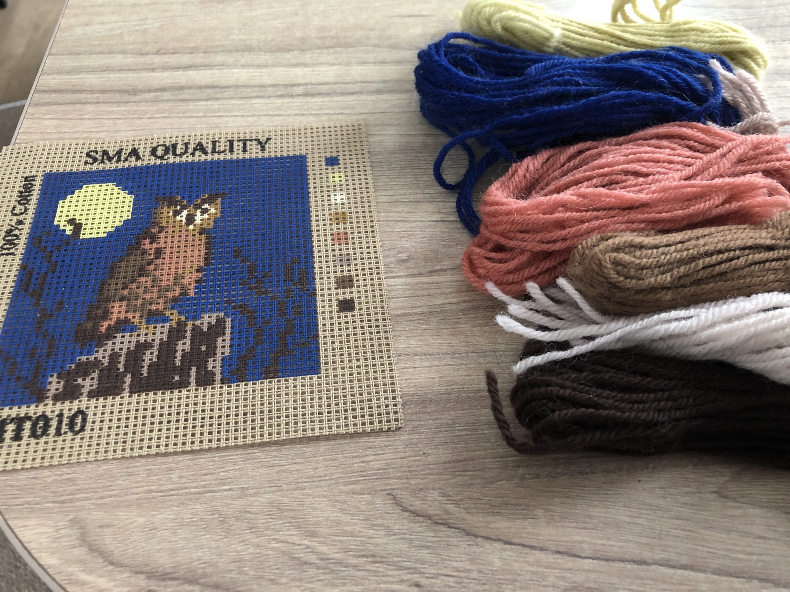 The kit includes the printed canvas, wool, needle and instructions.